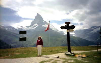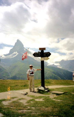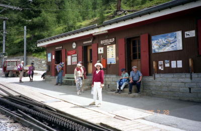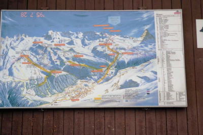Riffelalpリッフェルアルプの標識 板の白い矢印はWCの方向です マッタホルンに向かって、雉撃ち をされたら、困るからでしょうね